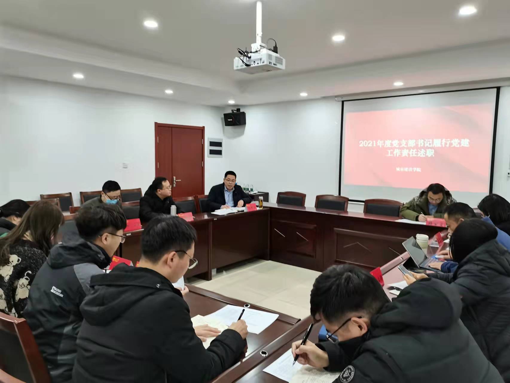 2022年1月5日下午,城市建设公司党委在天工楼302A召开党支部书记履行党建工作责任述职评议会,城建公司党委委员,教师、员工、行政7个党支部书记、支部委员与会。
