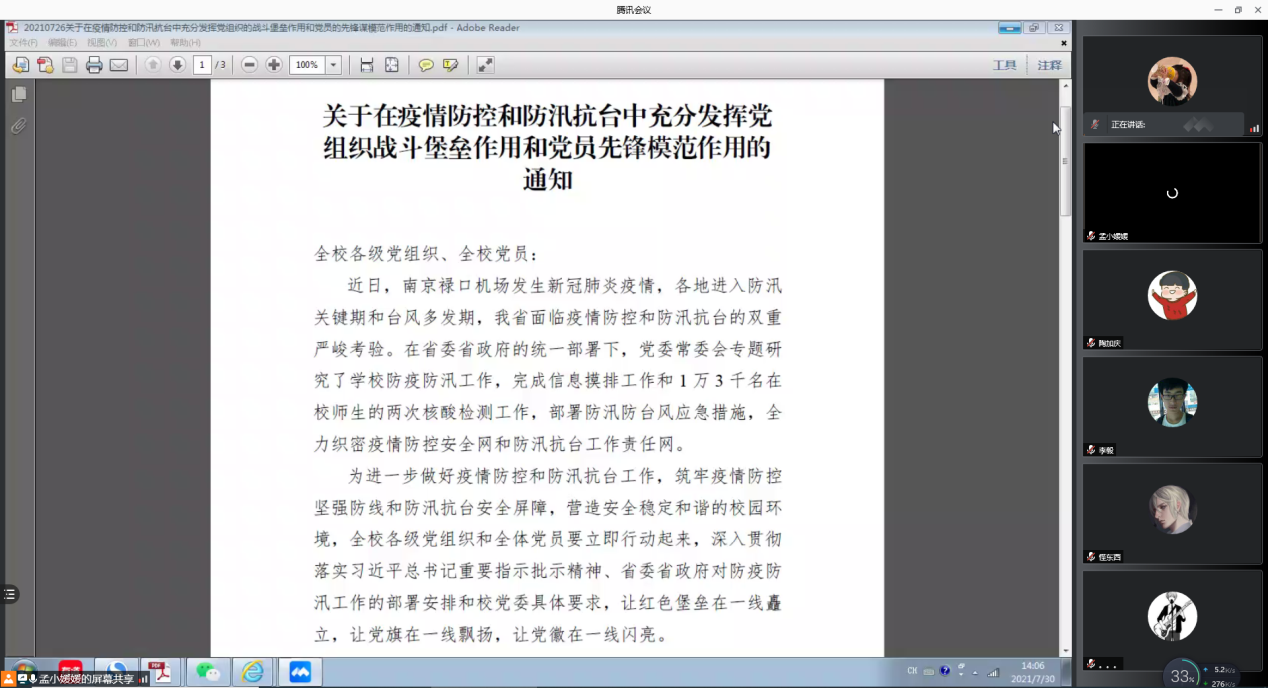 2021年730日下午14时,城建公司市政研究生党支部开展专题会议,组织共同深入学习《关于在疫情防控和防汛抗台中充分发挥党组织战斗堡垒作用和党员先锋模范作用的通知》。
