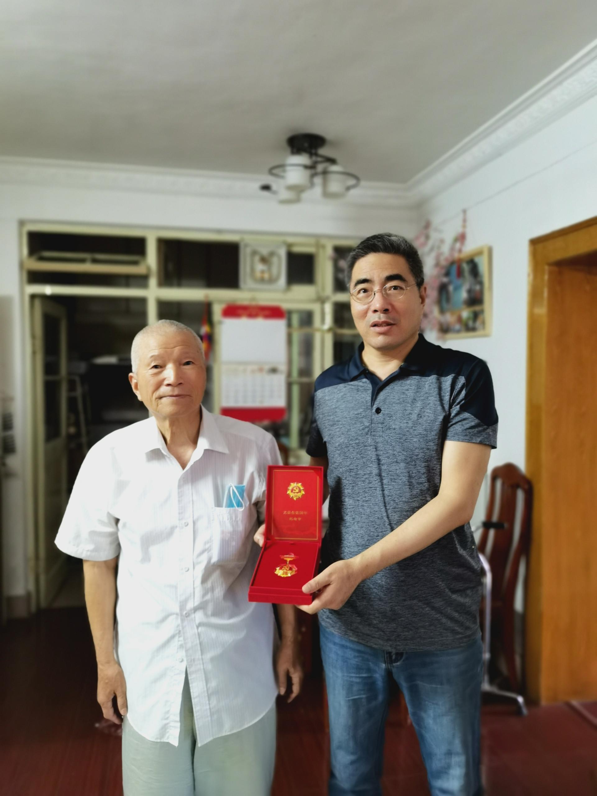今年党中央首次颁发“光荣在党50年”纪念章,公司党龄50年以上的2名老教师获此殊荣。6月29日下午,在周挺书记的带领下,公司开展“七一”走访慰问活动,上门走访老党员,为他们颁发“光荣在党50年”纪念章,感谢他们为党和人民作出贡献。