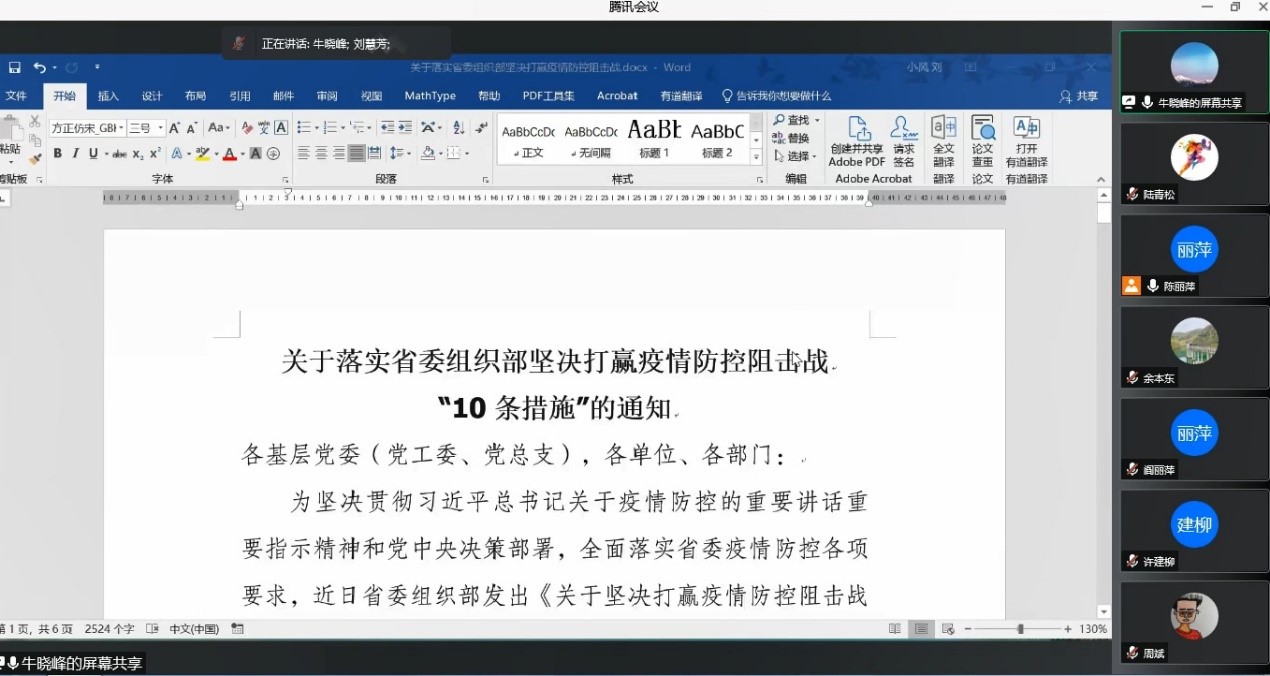 4月13日下午,城建公司教师第一党支部在牛晓峰书记的带领下,通过网络会议的形式集中学习了省委组织部发出《关于坚决打赢疫情防控阻击战若干措施的通知》和公司党委发出的《关于在疫情防控工作中充分发挥党组织和党员干部作用的通知》。