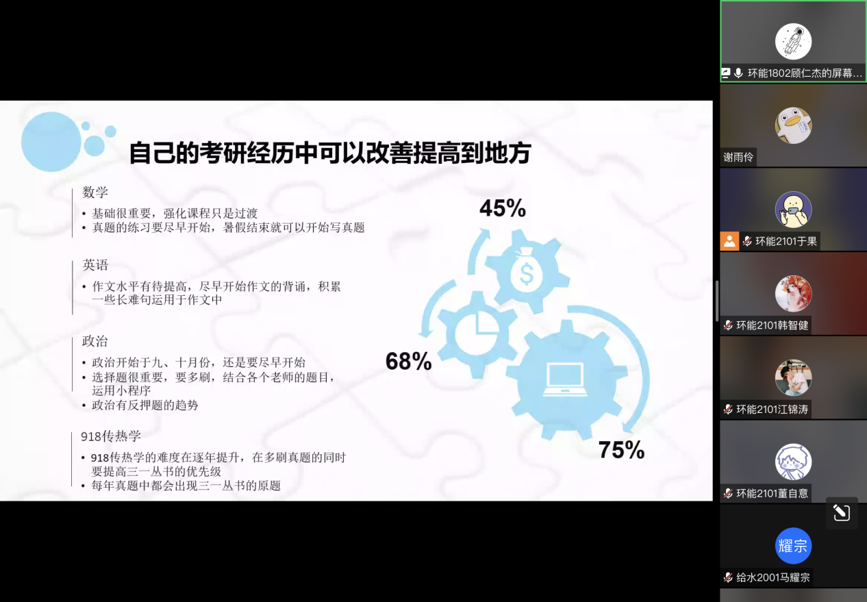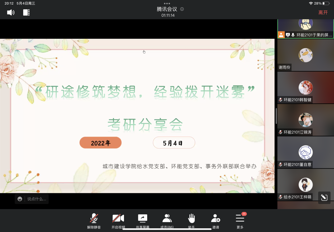 本次会议邀请本科生支部拟录取东南大学、中国矿业大学和本校本院的四位同学作经验交流。主持人开场后,季沈蕊、朱汉青、顾仁杰和王瑞杰四位同学结合自身考研经历,围绕考研择校、考研动机、复习时间安排、课程及参考书选择等方面做了全面详细的介绍,并鼓励学弟学妹们坚定目标,一战成硕。之后的线上答疑环节,参与分享的学长们耐心为同学们答疑解惑。会议最后提供了考研成功的学长们的联系方式,以便同学们进行交流。