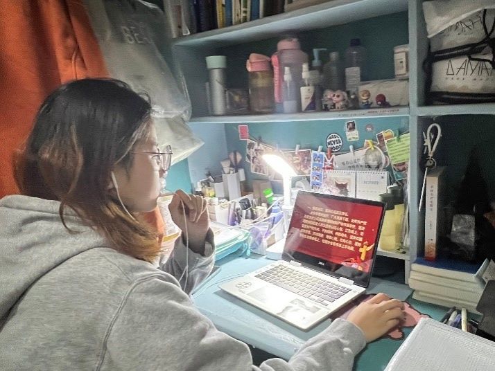 虽然线下课转为线上,但是“停课不停学”,本科生党支部的党员在寝室里专心学习,做好先锋模范带头作用,大三党员积极参与课堂,大四党员兼顾上课和考研、考公,用积极的行动面对防疫中出现的困难,营造浓厚的学习气氛和不怕波折的良好心态。同时,支部党员牢记疫情防控重大政治责任,积极配合七天五检的核酸政策,督促同学应检尽检,传达公司“守望相助,共克时艰”的抗疫精神。