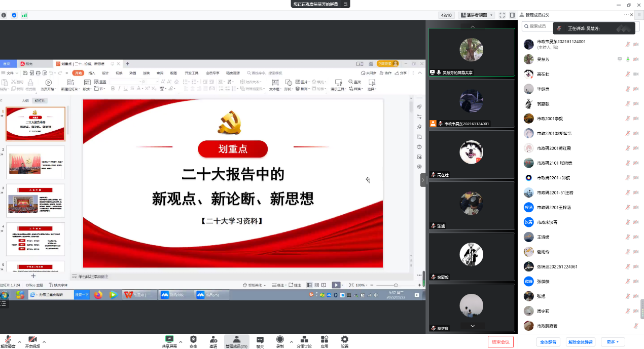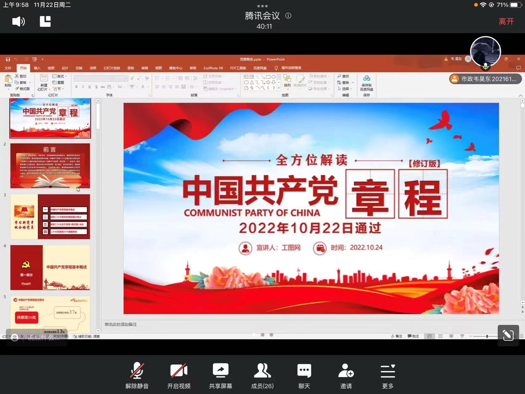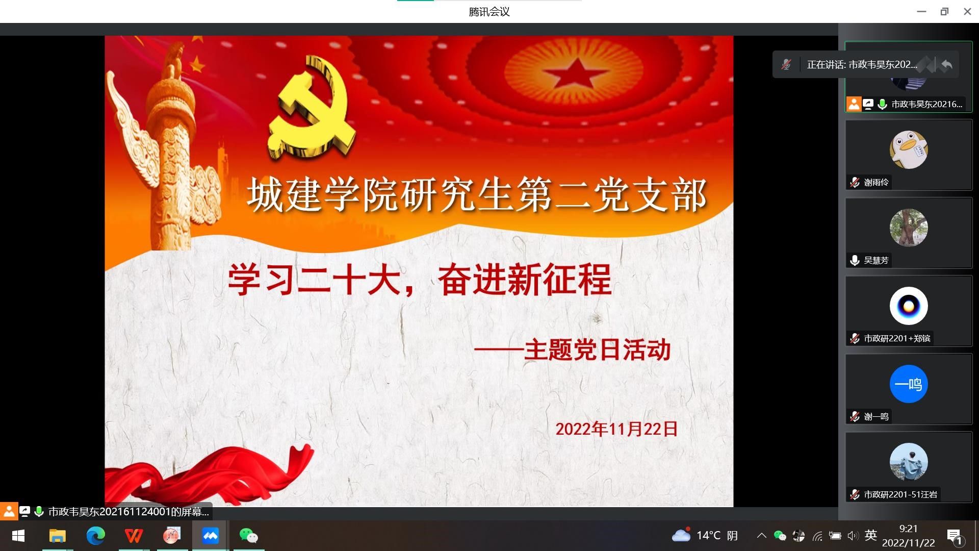 太阳成集团tyc234cc市政研究生党支部于11月22日举行在线会议,学习党的二十大报告和大会通过的《中国共产党章程(修正案)》,激励支部党员增强政治自觉思想自觉行动自觉,把思想和行动统一到党的二十大精神上来。本次活动支部全体党员参加。