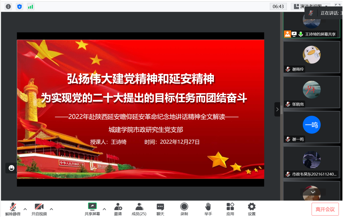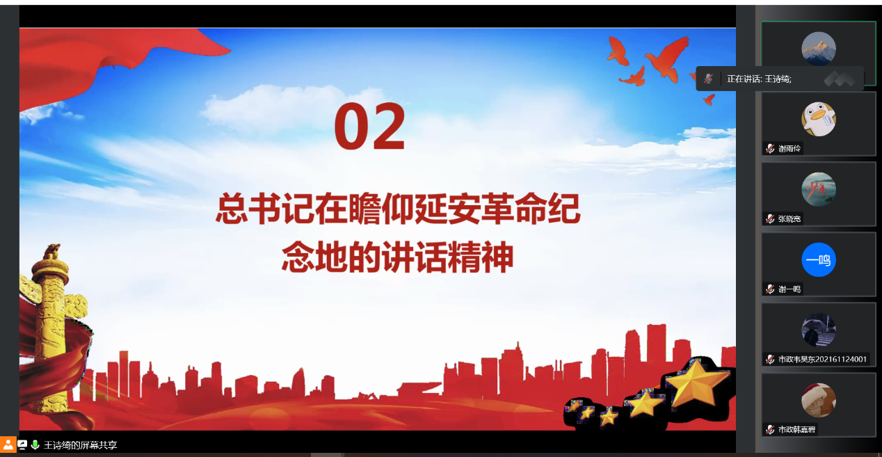 城建公司市政研究生党支部于12月27日下午举行在线会议,学习习近平总书记重要文章《继承和发扬党的优良革命传统和作风 弘扬延安精神》,激励支部党员坚定历史自信,增强历史主动,发扬斗争精神,为实现党的二十大提出的目标任务而团结奋斗。本次会议支部全体党员参加。