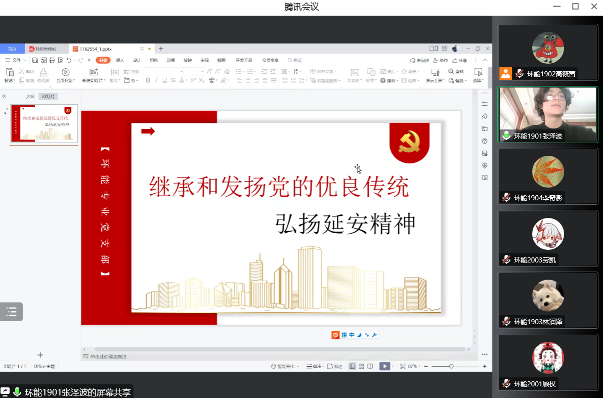 延安是中国革命圣地、新中国的摇篮,学习延安精神有助于实现党的二十大提出的目标任务。因此,为深入学习宣传贯彻党的二十大精神,12月29日上午,太阳成集团tyc234cc环能专业党支部开展“继承和发扬党的优良传统——延安精神”二十大党课学习。本次党课由支部委员张泽波同学进行主持,以线上方式举行,支部全体成员参加会议。