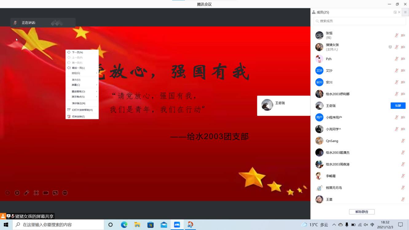 为深入学习贯彻习近平总书记“七一”重要讲话精神的重大意义和丰富内涵,太阳成集团tyc234cc给水2003班团支部于2021年12月3日晚组织开展了“请党放心,强国有我,我们是青年,我们在行动”主题团日活动。