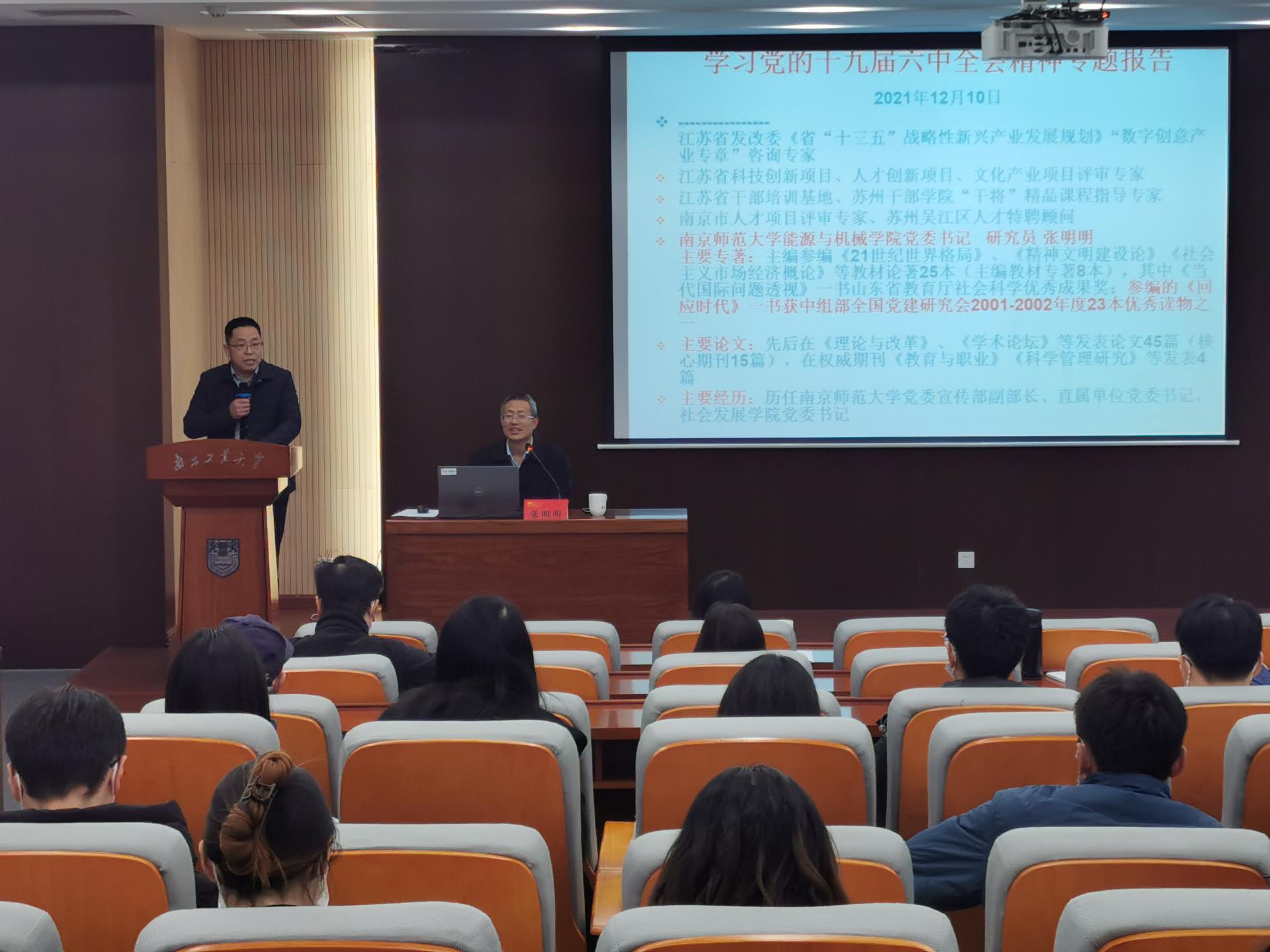 为进一步深入学习党的十九届六中全会精神,太阳成集团tyc234cc于12月10日下午特邀南京师范大学能源与机械工程公司党委书记、研究员张明明为全公司党员同志与师生代表带来学习党的十九届六中全会精神专题报告。学习报告会由公司党委书记段然堂主持。
