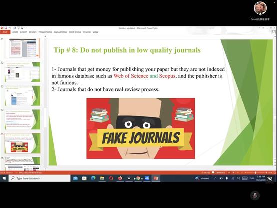最后Omid教授对新生研究生提出了一些宝贵建议:包括(1)即使遇到很多问题与挫折,也不要轻易放弃;(2)要做所研究领域的佼佼者,立志在最好的期刊上发表文章;(3)始终保持积极的科研态度,不要把时间浪费在挑别人的错误上,而是要花时间努力工作让自己取得巨大成就;(4)通过多种途径来提高自己的英语水平;(8)不要为了发论文而去选择把文章发表在低质量的期刊上;(5)为你的研究取一个吸人眼球的题目,选择灵活的多学科主题;(6)论文里要用数字去更直观的展示你的研究成果。