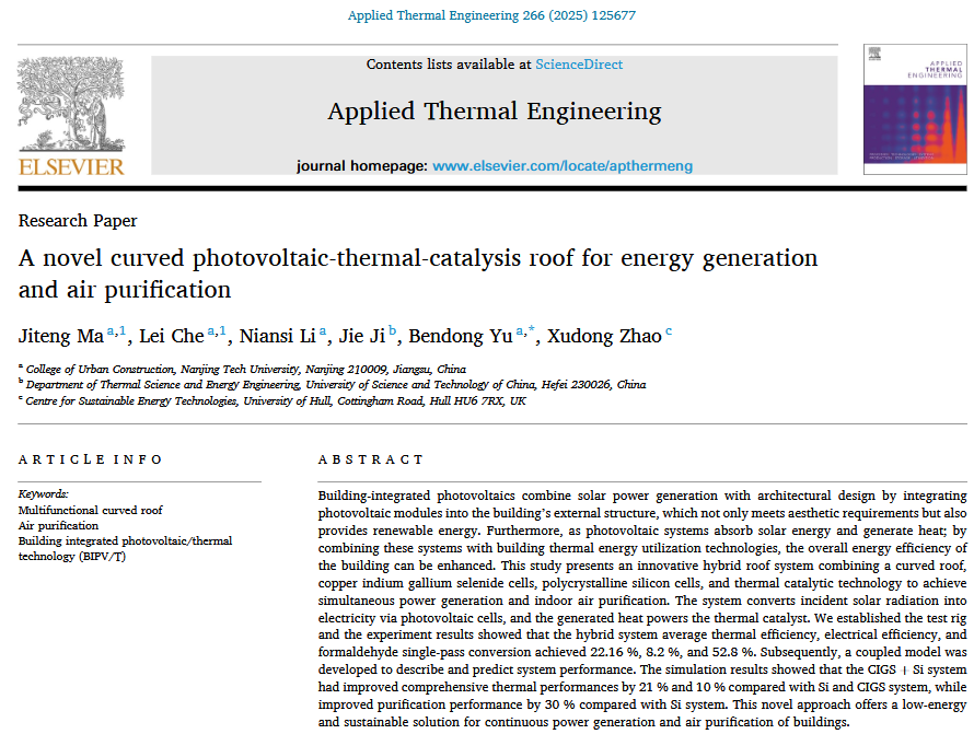 近日,余本东教授团队在JCR-Q1区、中科院二区TOP期刊《Applied Thermal Engineering》(IF=6.1)上发表了题为“A novel curved photovoltaic-thermal-catalysis roof for energy generation and air purification”的研究论文。第一作者为环能2201班本科生马骥腾同学,余本东老师为独立通讯作者,太阳成集团tyc234cc为第一完成单位和通讯作者单位。