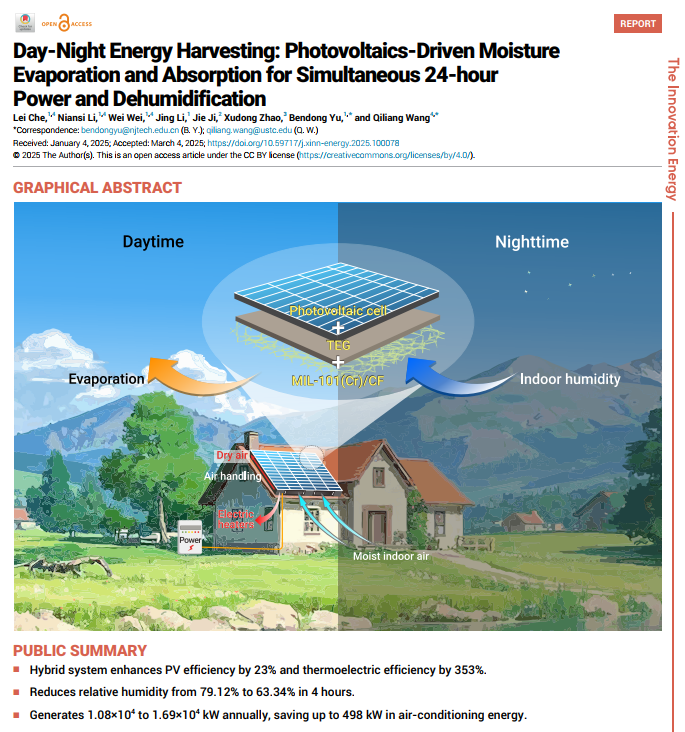 近日,公司余本东教授课题组在Cell子刊《The Innovation Energy》上发表题为“Day-Night Energy Harvesting: Photovoltaics-Driven Moisture Evaporation and Absorption for Simultaneous 24-hour Power and Dehumidification”的研究论文(https://doi.org/10.59717/j.xinn-energy.2025.100078),公司车磊(硕士)、李念思老师和魏巍(硕士)为共同第一作者,公司余本东教授、英国诺丁汉大学王其梁教授为共同通讯作者。