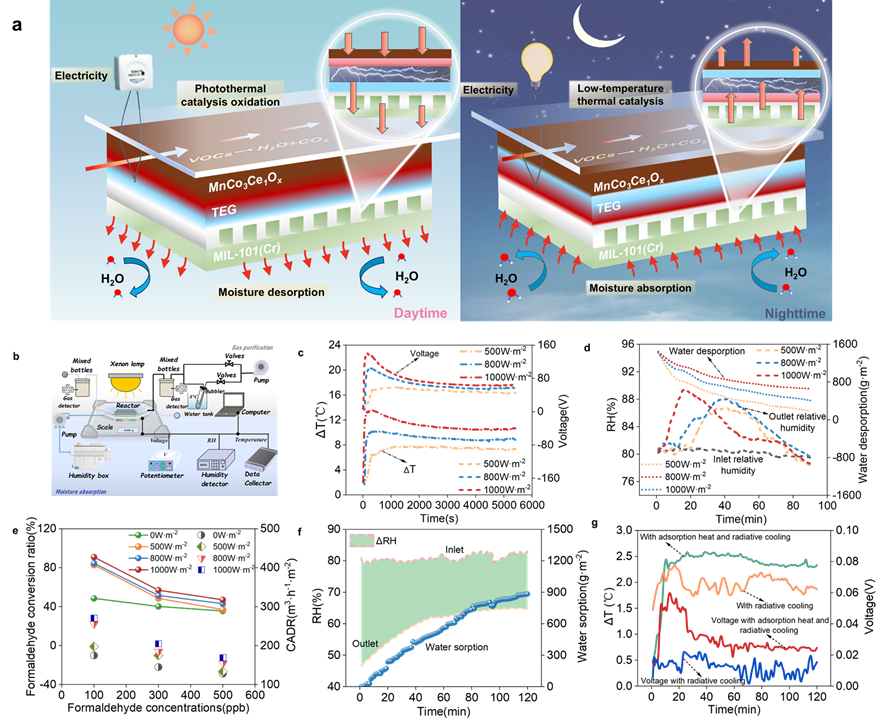团队开发新型红外光驱动光热催化材料Mn7Co3Ce1Ox,全光谱太阳能吸收率为 94.3%、大气窗口发射率为 95.7%,对室内VOCs去除率达 90.9%,材料具有净化、集热、辐射制冷多重功能。此外结合Mn7Co3Ce1Ox材料、温差发电(TEG)和金属有机框架材料(MOFs),提出PTC-TEG-MOF混合系统,协同利用Mn7Co3Ce1Ox白天集热-催化、夜间辐射制冷效应与MOFs材料白天脱附吸热-夜间除湿放热效应,实现发电、除湿和空气净化功能。结果表明,系统电功率提升 640.1%,室内湿度降低 16.8%,产生干净空气 270.8 m³·h⁻¹·m⁻²。在中国省会城市建筑应用时,年功率为 30-105.3 kW·m⁻²,空调节能为 11.2-353.5 kW·m⁻²,干净空气为 296.3-1119.3 m³·h⁻¹·m⁻²。该成果首次实现以城建公司为第一单位在国际知名综合类期刊上发表文章的突破。